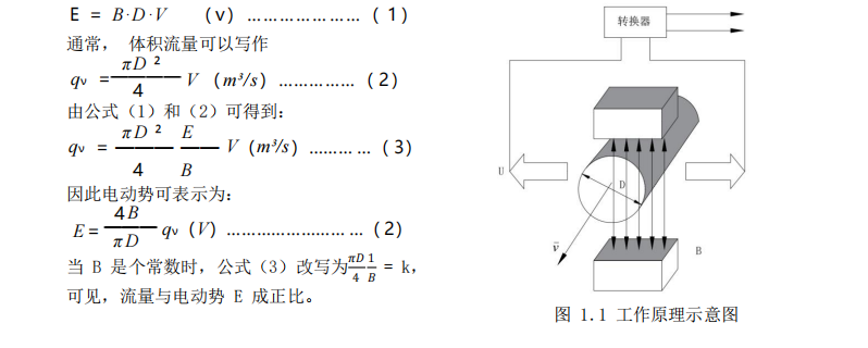電磁流量計的工作原理基於法拉第電磁感應定律。當一個導體在磁場內(nèi)運動,在與磁(cí)場方向、運動方向相互垂直方向的(de)導體兩端,會有感應電動(dòng)勢產生。電動(dòng)勢的大小與(yǔ)導體運動速度和磁感應強度大小成正比。在(zài)圖 1.1 中,當導電流體以平均流速 V(m/s)通過裝有一對測量電極的一根內徑為 D( m)的絕(jué)緣管子流(liú)動時,並且該管子處於一個均勻(yún)的(de)磁感應強(qiáng)度為 B(T)的(de)磁場中。那麽(me),在一(yī)對(duì)電極(jí)上就(jiù)會感應出垂直於磁場(chǎng)方(fāng)和流動方向的電動勢(E)。由電磁感應定律可寫做(1)式: