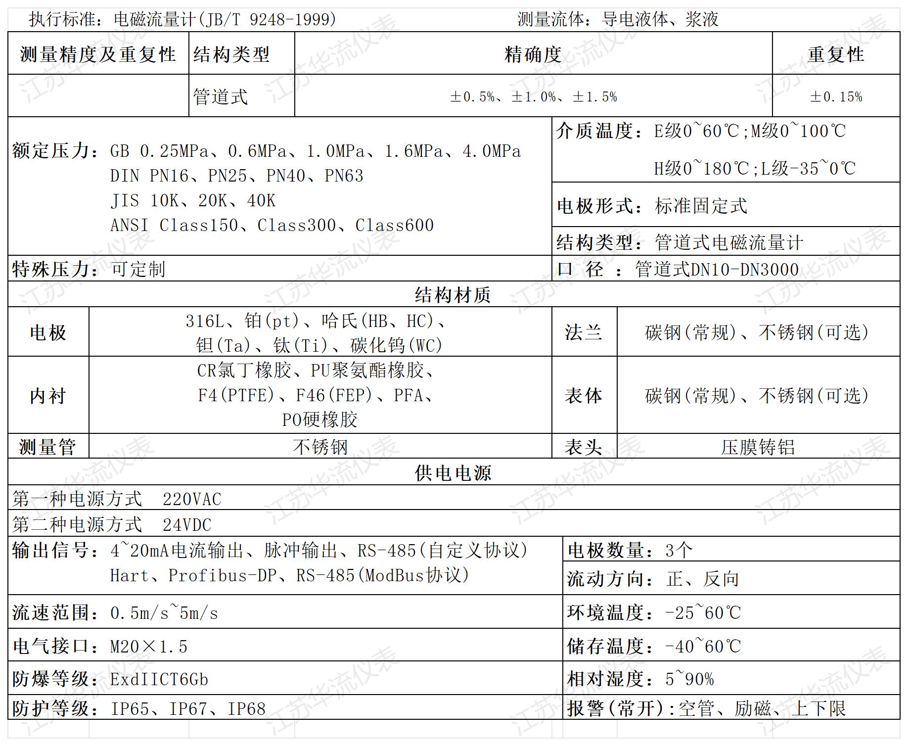 精確度:±0.5%、±1.0%、±1.5% 介質溫(wēn)度: E級0-60°C; M級0~100°C H級0-180℃ ;L級-35-0°C 法蘭:碳鋼(常規)、不鏽鋼(可選) 測量流體: 導電液體、漿液 結構類型:管道(dào)式(shì)