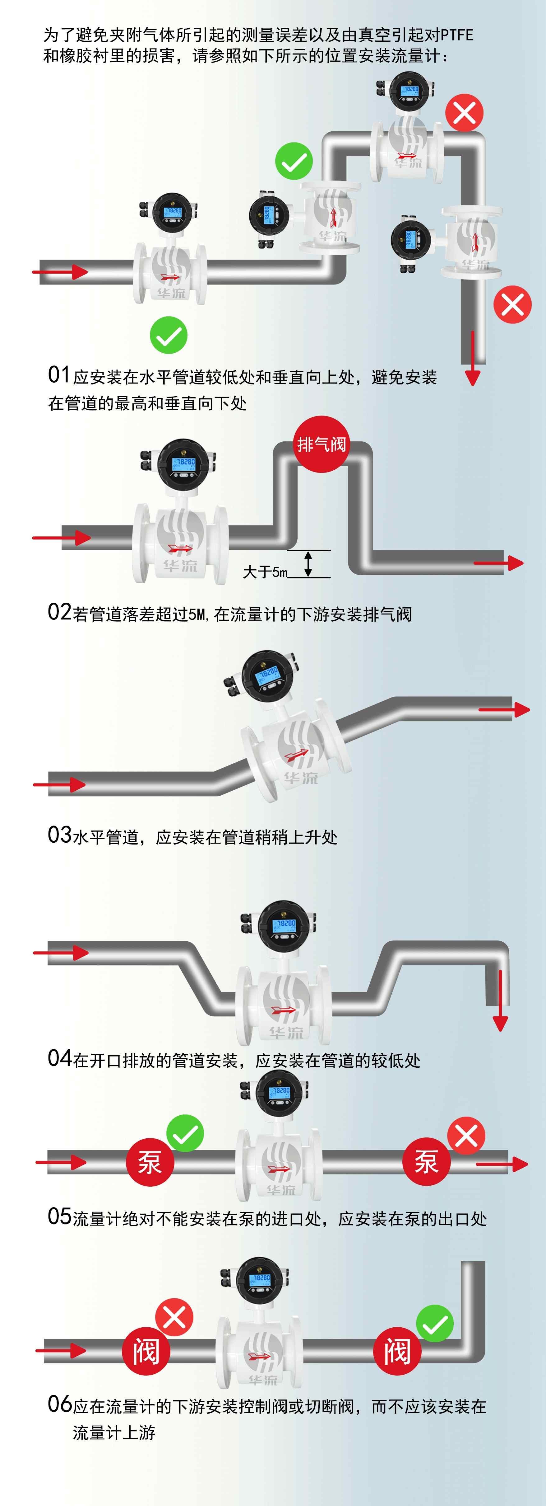 為了避免夾附氣體所引起的測量誤差以及由真(zhēn)空引起對(duì)PTFE和橡膠襯裏的損害,請(qǐng)參照如下所(suǒ)示的位置(zhì)安裝流量計: